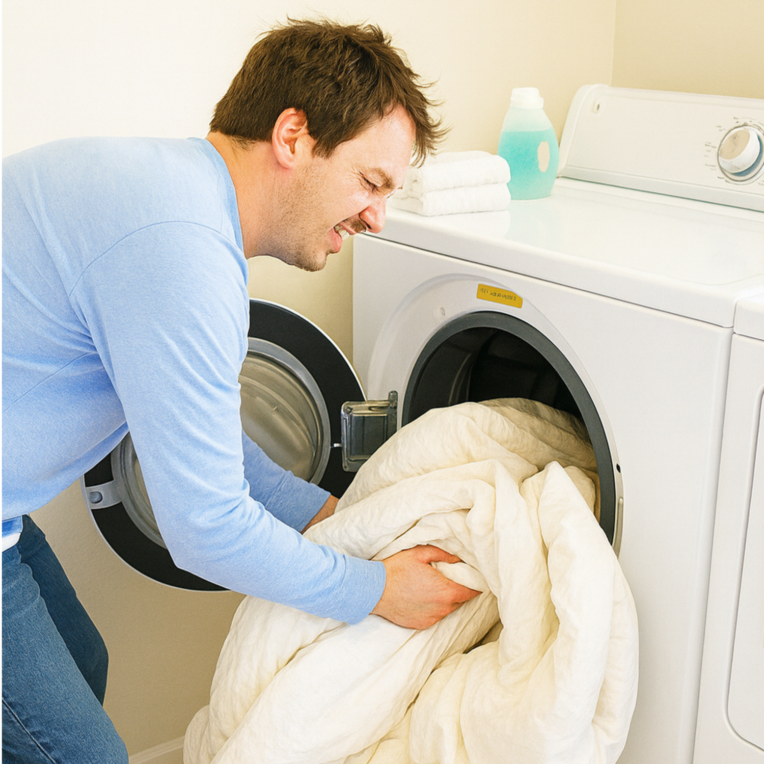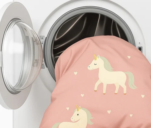 Pas besoin de retirer la housse de couette. Il suffit de mettre la couette entière dans la machine et c'est tout !